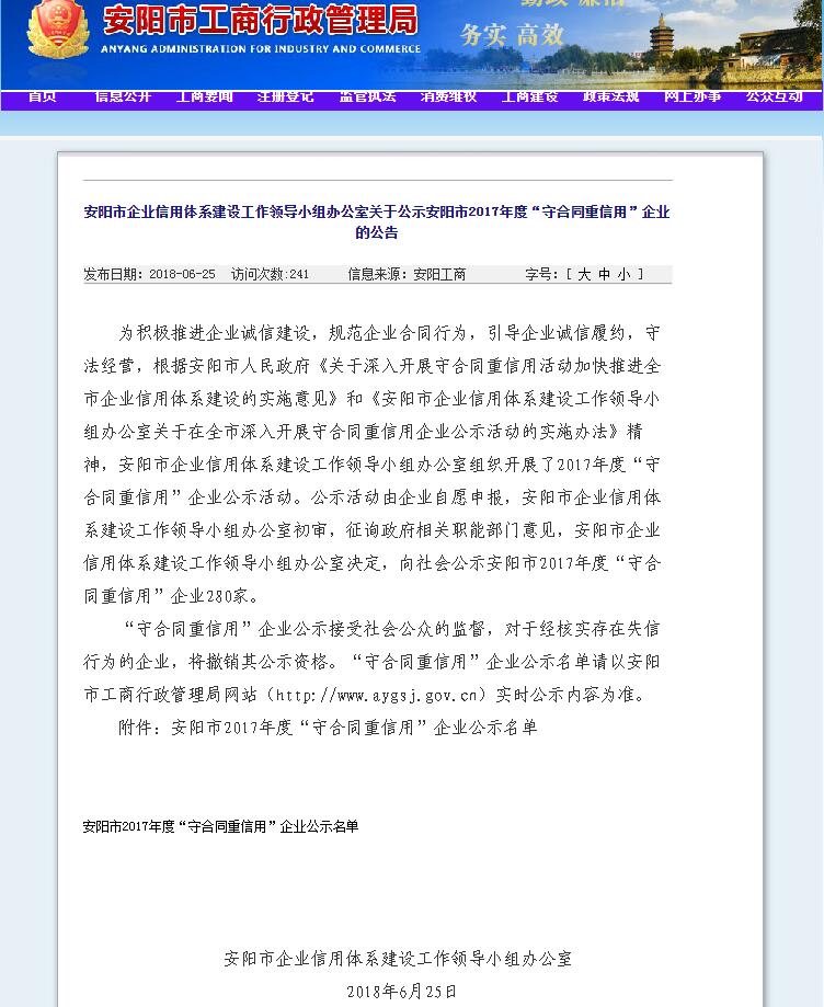 近日,从安阳市工商行政管理局网站获悉,河南省PA视讯集团入口工程有限公司再次荣获安阳市2017年度“守合同重信用”企业荣誉称号。这是公司连续两年获得该荣誉,公司凭借长期积累沉淀的强劲实力和始终如一的卓越服务,再次得到行业与社会的认可。